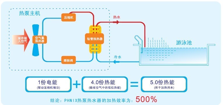 室内泳池在设计的时候一般都会通过各种各样的方式对室内游泳池的水体进行加热,泳池恒温热泵就是通过逆卡诺循环原理将空气中的低品位热能转化为高品位热能,用于给泳池水恒温加热。